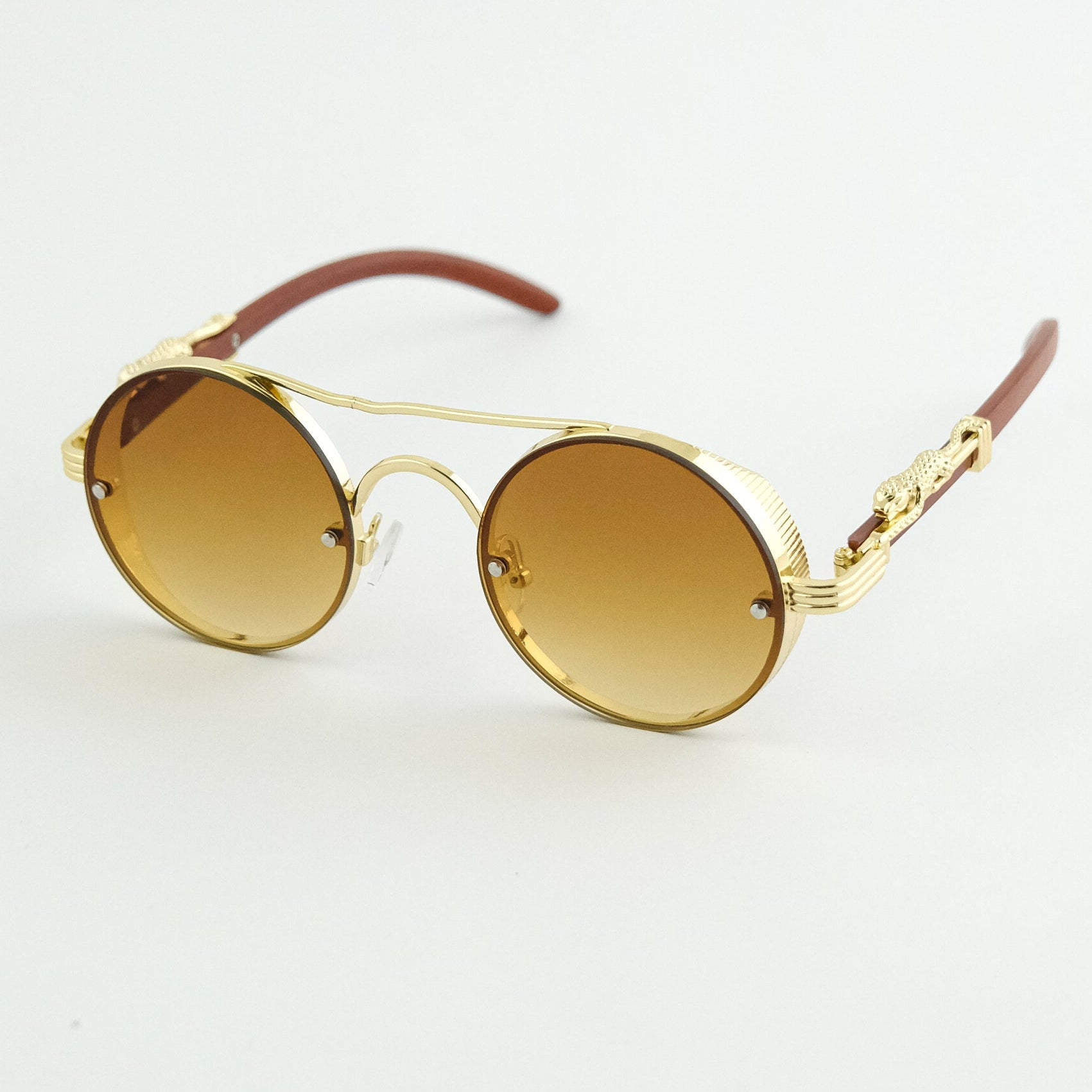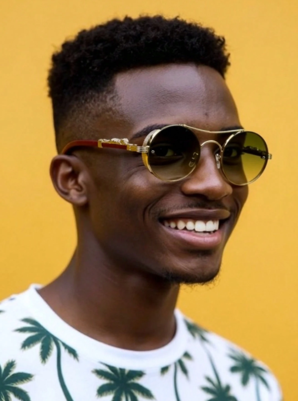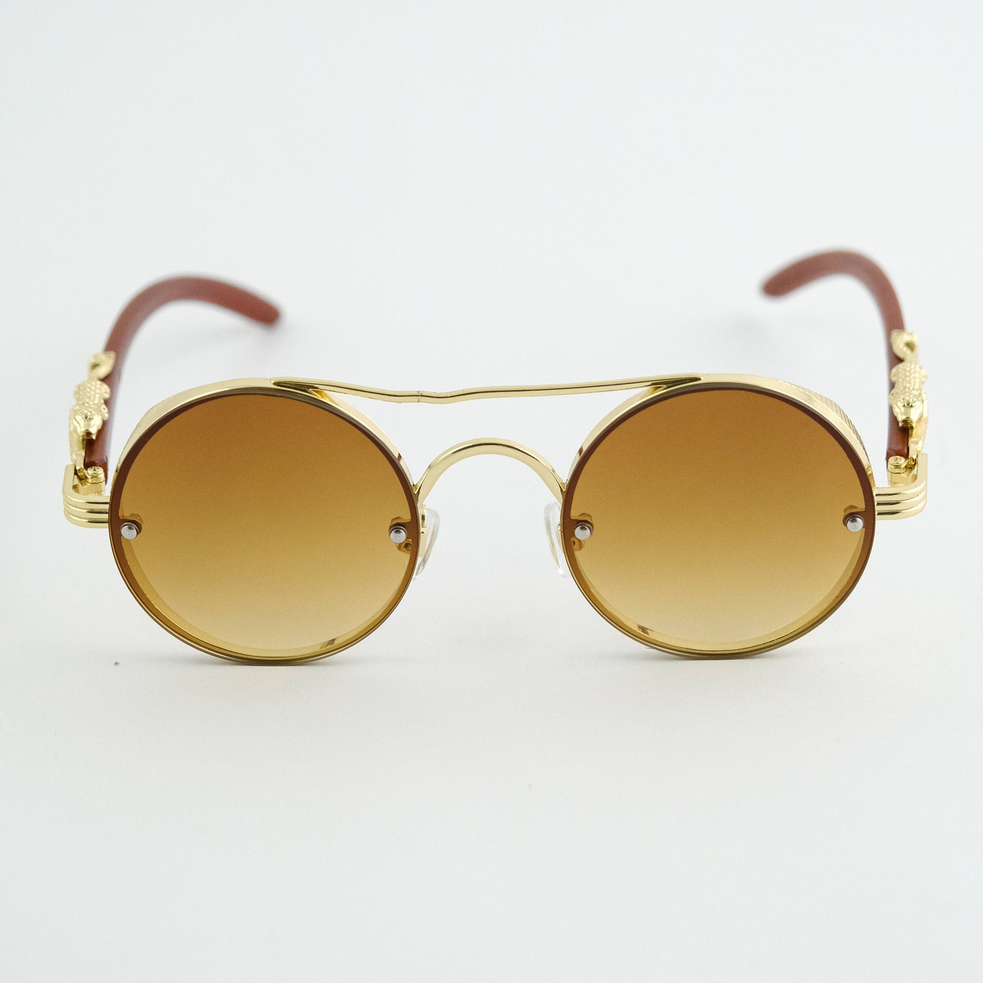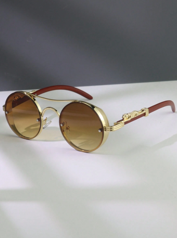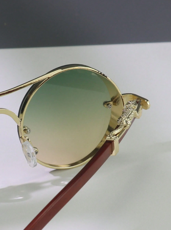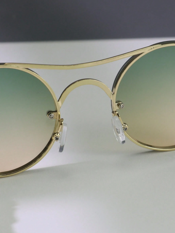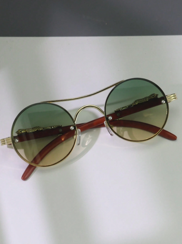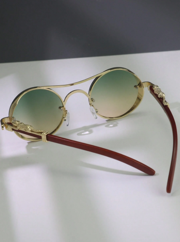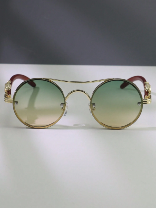 A statement born from detail. Solaris Monarch merges golden sculpted metal with round gradient lenses—luxury vintage flair meets bold street attitude. Each curve feels refined, each line deliberate. Available in two striking tones: Green–Gold Fade & Brown–Gold Fade.